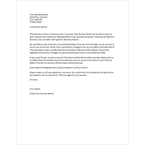 Sample letter for business closure 2 date: We will cease trading on. It is with a heavy heart that we at [ business name] must announce the closure of our business.